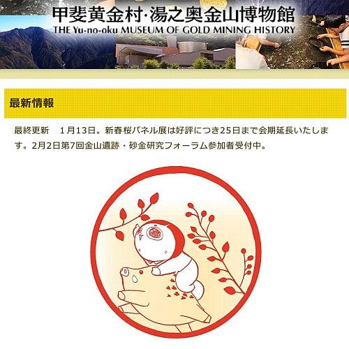 どなた様にも、この新しい年がよい年になりますように・・・。本年もどうぞよろしくお願い申し上げます。 湯之奥金山博物館は、明日2日より開館をいたします。明日は水曜日ですが、特別に開館となります。重ねてよろしくお願いいたします。