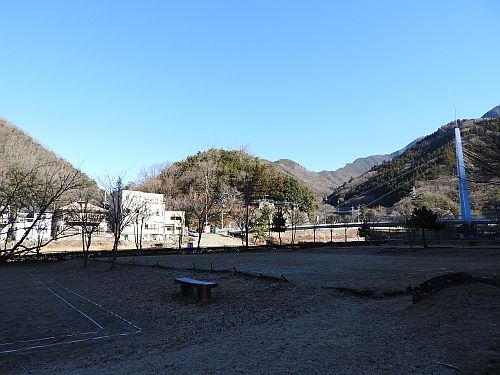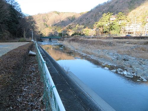 今日のお昼前の、湯之奥金山博物館の正面玄関前に出ているウェルカム・ボードです。昨日までは、門松や新年の賀詞の掲出がありましたが、それらがとれて、通常のモードになってきています。 ボードのご案内の中に、「『おやまかざり』展示中!」の文字が注目ですね。 それから、ボードの上半部には、向かい合わせの景色が反映されていますが、そこは明るい春の日差しがあふれていて、ボードをまぶしくさせています。 ウェルカム・ボードに映った春の日差しを確認するため、下部川の川縁まで出てみました。もう、ここまで日差しが戻ってきています。もうちょっとでリバーサードパークにも陽が当たるようになりますね。