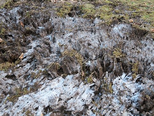 湯之奥金山博物館の建物の周りのあちこちに、霜柱ができています。午後1時30分をちょっとまわった段階での観察ですが、その霜柱は、ほとんど融けることがありません。 よくみると、長く成長した霜柱には、年輪のような縞模様が見られます。日ごとに氷続け、伸びてきていることを物語っているのでしょう、きっと。