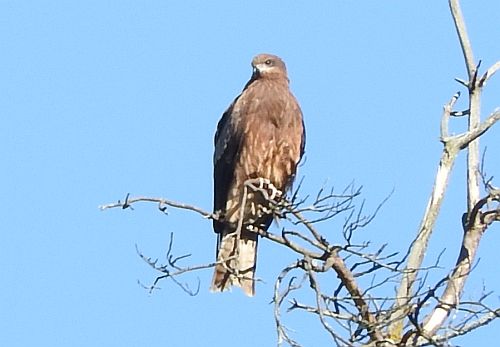 湯之奥金山博物館の玄関前から見渡せる場所に、よくトビなどがとまる枯れ木がありまして、先日(1月14日)も、1羽のトビがとまっていました。鋭い視線が感じられました。