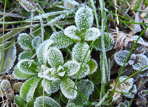 湯之奥金山博物館の隣の下部リバーサイドパークのお昼前のスケッチです。土は多くの場所で氷上がり、地表の植物などには、白く霜が降りていました。というか、空気中の水分が植物の葉や枯れ葉などの上に小さな氷となっているのでした。 写真の植物は耐寒性のあるものらしく、葉や茎の組織がしっかりしているのでしたが、一方で、植物を構成する細胞が凍って、枯死してしまうものも見られます。