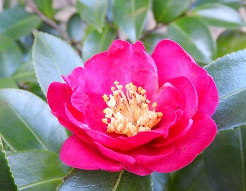 湯之奥金山博物館の建物周りにあるサザンカ、生け垣のようになっていますが、そこにこうした紅色の花が見られます。寒さをこらえて咲いてくれています。暖かな本格的な春を待ち焦がれつつ・・・。