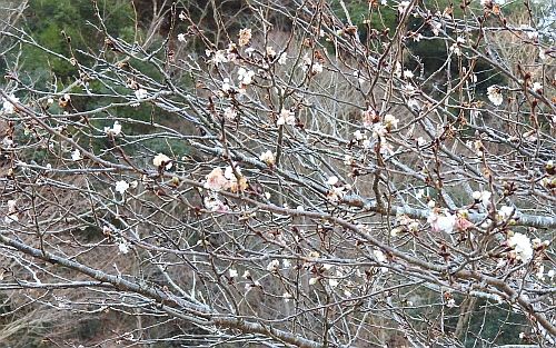 お正月も、サクラは咲きます。 湯之奥金山博物館に隣り合う下部リバーサイドパークの十月桜です。日中でも霜柱が融けない厳しい寒さですが、十月桜は、咲き続けています。花開いて直ぐに凍り付くので、花の咲き続ける期間は短くなっていますが、まだつぼみも多く、春まで咲き続けてくれそうです。