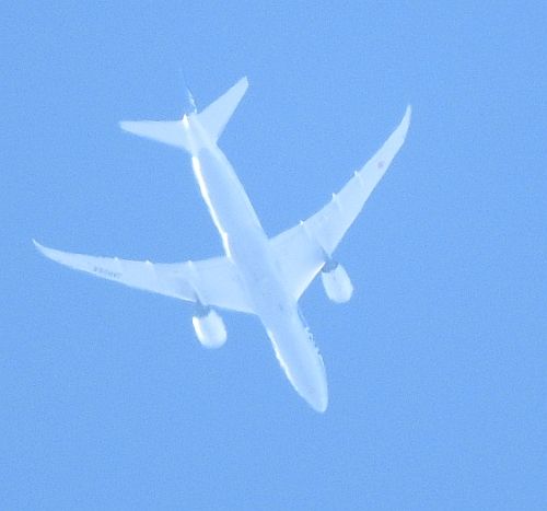 以前にもよく取り上げていますが、湯之奥金山博物館の上空は、羽田などを発した西行きの定期航路に当たっています。なので、よく通過する飛行機が見られるのですが、時にとてもクリアにとらえられることがあります。 こちらは、午前10時30分過ぎに見られたANA機で、B-787の機首に「787」と大きく表されているものです。 こちらは、午後4時30分過ぎのJAL機で、「エコジェット・ネーチャー」の特別塗装機だとわかるものでした。