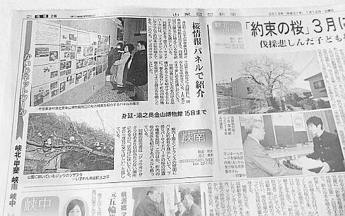 博物館スタッフが新聞をチェックして画像を撮ってくれました。本日(1月12日)、地元紙に、湯之奥金山博物館で現在開催中の『2019 新春サクラ情報パネル展』のことが紹介されました。 もうちょっとわかりやすくしてみました。でも、やはり実物(カラーのパネル)を見ていただきたいな…。会期はもう少しですが、好評であれば若干の延長もあるかと思われます。どうぞ湯之奥金山博物館にお出かけください。