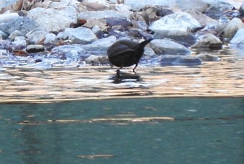 だいぶ離れた場所で、後ろ姿の鳥を見つけました。きっと、あれだな・・・。 頭の中を川の流れの中につけて、えさを探していました。寒くないのかしら・・・。 顔を上げましたが、望遠画像がうまくしゅとくでききれていませんでした。顔の表情がよくわかりませんね。でも、この鳥の正体は、カワガラスです。これまでも、何度か取り上げてきていますよ。