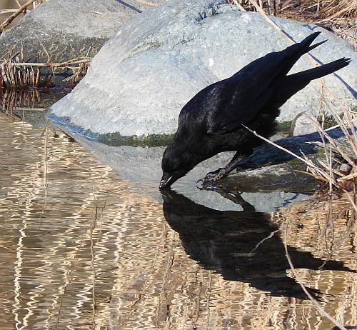 湯之奥金山博物館のすぐ隣を流れる下部川で、このところ見られる野鳥を取り上げていますが、その第5弾は、ハシボソガラスです。 一般にいわれるカラスですが、くちばしが太くおでこが出っ張ってるのと、くちばしが細くおでこが出てないのとの2種があって、前者がハシブトガラス、そして後者が今回に見るハシボソガラスです。 ハシボソガラスは、ハシブト・・・が都会はなのに対し、ローカル好みだと、手元の図鑑の情報にありました。 水を飲んでいるのでしょうか、その周りを包む光が春めいてきているのが、感じられました。下部川の対岸までは、春が近づいているようです。
