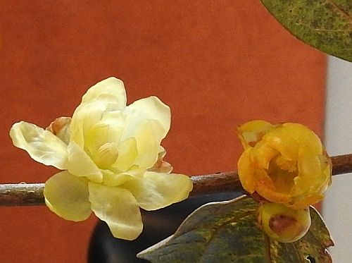 湯之奥金山博物館の受付カウンターの上の花入れに、ロウバイの花が加わりました。ほのかな香りをただよわせ、やさしい色でさいています。 ナンテンも、スイセンも、それから今回のテーマのロウバイも、みんな地元の方が時折に届けてくださるものです。博物館にお見えになる方を、少しでも華やいだ雰囲気でお迎えできたら…、ただそうしたことだけで年中、お花のサポートをしてくださいます。ありがとうございます。