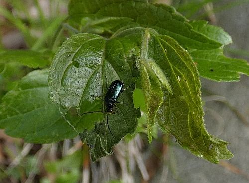 博物館のまわりで、よく見られるタンポポです。その花を見ていたら、何か舌状花の中にかくれるようにしている虫が見られました。 このタンポポ、ずいぶん舌状花の割合が多いですね。その中に、黒っぽい光沢のある小さな甲虫類の虫さんがいました。 こうしてPCに取り込んで観察してみると、他にも小さな虫がいましたが、そちらは、今回パスして、甲虫の仲間に注目していきます。 もぞもぞ花の中で動いているうちに、姿がわかる時がきました。黒っぽいつやは、よく見ると、やや瑠璃色がかっています。 ネットで調べてみると、少ししてルリマルノミハムシだとわかりました。いつもお世話になっている「昆虫エクスプローラー」さんのHPの関係記事には、「サクラ、コブシ、タンポポ、リョウブなどの花に集まる。春に見る機会が多い。」とありました。 また別な情報では、バラの花を食べる害虫なのだということでありました。