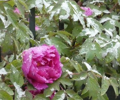 4月10日の朝のことでした。 わが家の見頃を迎えたボタンの花に、しずこころなく、雪の積みゆく・・・。なんか、天候があまりおだやかでない4月だったような気がします。ゆくすえ、平らけくあらまほしけれ・・・。