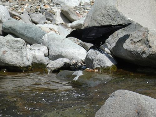 下部川の水際で、カラスがチョンチョン、移動していました。行水でもするのかしらと、期待してしばらく見ていましたが、どうやら川岸にありそうな餌を探していたようでした。カラスも繁殖の時期を迎えて忙しいようです。