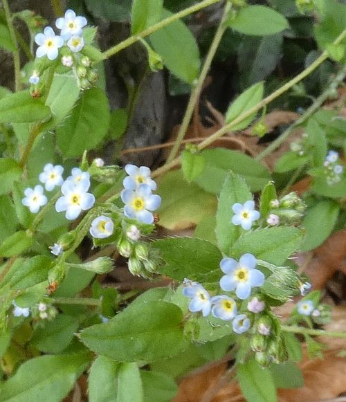 湯之奥金山博物館の周囲のあちこちで、このキュウリグサの花、とてもよく見られるようになっています。今回のは、株が多きくよく育った場所でのキュウリグサでした。