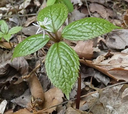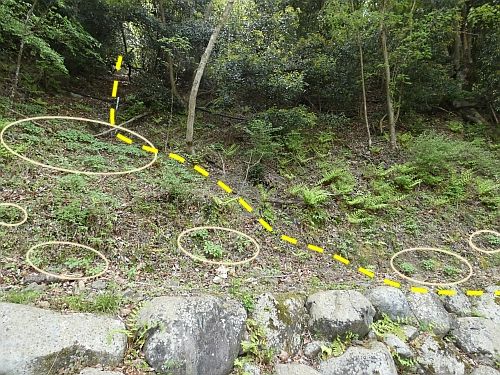 前回、ヒトリシズカをご紹介しましたが、今回紹介する写真は、まずはそのヒトリシズカの生えている場所を少し広めに見たものです。 白の長円で示したのは、ヒトリシズカの株の生えている場所です。このように、いくつも点在していたのです。それを見わたしながら、気付いたことがありました。それは、けものが繰り返し通っている道、いわゆる “けもの道” だろう と思われるものでした(黄色の破線)。そして、これまでの周辺の観察の積み重ねから、この場合のけものは、おそらくシカだろうと思われるのです。 「1つの…」とタイトルに冠してあるのは、こうしたけもの道は、博物館の周りでたんに1つだけではなく、たくさんあるものの1つということを意味しています。