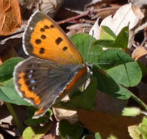 ベニシジミがクローバーの葉にとまって、日光浴中でした。翅の表側が観察できます。それで、オスの個体だとわかります。また前翅のオレンジがあざやかで、きれいに見えました。夏型になると、鱗粉に黒い色素が増えて、黒ずんだ感じになっていくそうです。