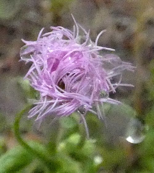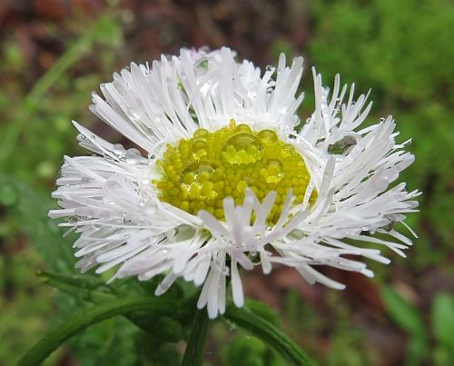 はげしい寝ぐせがついた頭みたいです。いったい何だろうと、カメラを向けました。傘を差しての撮影なので、余りうまくはないですが・・・、雰囲気をつかんでみてください。 もう少しひいてみました。これは、ハルジオンの雨の日の姿であったようです。夕方や雨の日は、ハルジオンの舌状花、とじるのです。そうした中で、まだあまり成長していない花が、雨の中で閉じていたものと考えました。