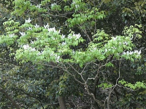 メロディーブリッジの南詰のあたりから、「黄金の足湯」越しに見える一面の緑の中に、白い花が花盛りとなっているのが確認できました。 マルバアオダモの木が、あそこでも花盛りとなっています。 デジカメで無理して望遠撮影。分解能がまったく不十分ですが、マルバアオダモの花が白く咲いているのは、十分に確認できるかと思います。