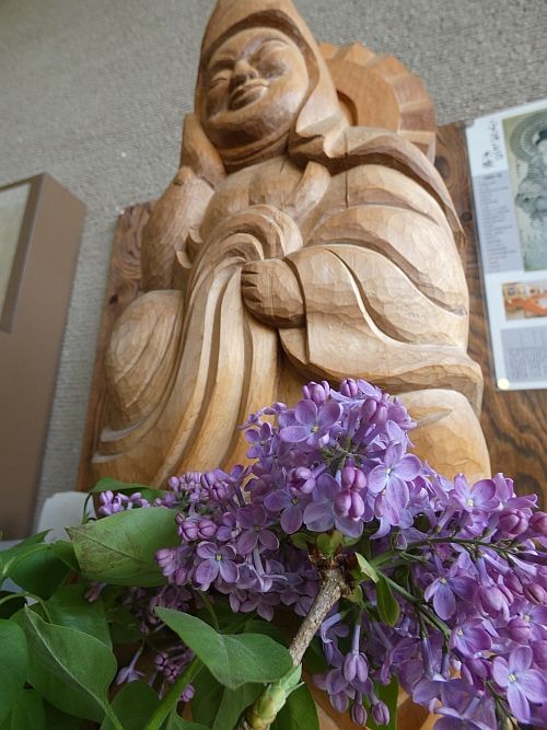 湯之奥金山博物館のエントランス、風除室で、ライラックの花が皆さまのご来館をお待ち申し上げております。 ライラックの花は、風除室に展示してある木喰作品レプリカのうち、「如意輪観音」さんに添えられたものでした。