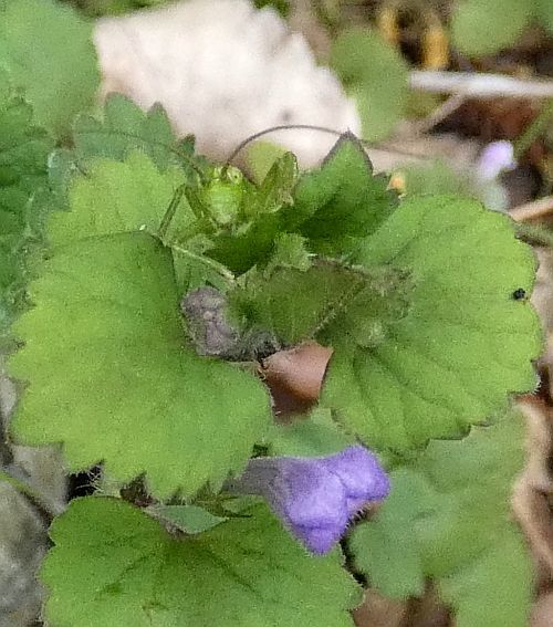 カキドオシの花を見ていた時、何やら視線を感じました。おわかりになりますか。 しばらくして、その存在をあらわしてくれました。まだ翅の準備されていない、こどものキリギリスの仲間です。 カキドオシの花の場所だけでなく、博物館の前庭のまわり、あちこちに見られます。