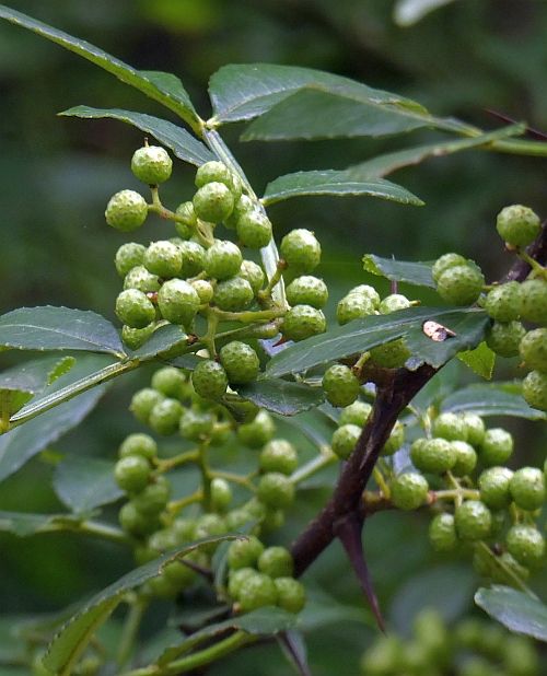 丸くて表面にちいさなボツボツがある緑色をした実がいっぱい。イヌザンショウのまだ若い実です。 植物の名前に「イヌ-」なんとかっていうの、よくあるのですが、たいていは「イヌー」がつかない本家が優秀なのに対し、役に立たないといった意味合いで名付けられるものと聞いたことがあります。イヌザンショウの場合も、葉や実の香りを楽しむサンショウに対し、香りが弱く、本家にはかなわないものだから、イヌザンショウとされているようです。でも、まったくダメなわけではなく、イヌザンショウの実から昔は油をとって「灯火や整髪につかった」との説明が手元の図鑑に見られました。 写真は、前回のヤマブキを見た場所と、隣り合わせに見られたものです。