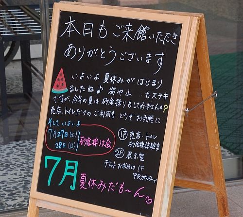 今日は7月最後の水曜日。というか、令和元年の7月は、今日でおしまい。砂金掘り大会とか、いろいろありましたが、多くの皆さまのご支援やスタッフの頑張りによって、つつがなく月越しをすることができます。篤く感謝申し上げますとともに、時節がら、謹んで暑中お見舞い申し上げます。