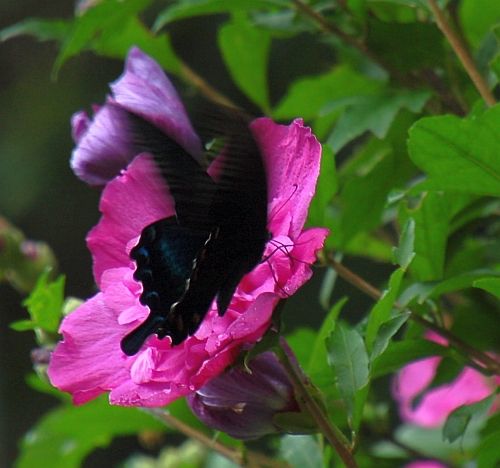 ムクゲの花を眺めていた時、視界に突然に黒い物体が、アゲハチョウの仲間です。でも、何アゲハだろう・・・。 アゲハチョウの仲間は、花にとまり吸蜜するときも、翅をとめることはあまりなく、ずっと小刻みに羽ばたかせています。これじゃちょっとわからないな。 カメラの感度を上げて、シャッタースピードも上げて撮りなおしました。どうやらミヤマカラスアゲハだと思われます。大きな花に大きなアゲハ、夏です。