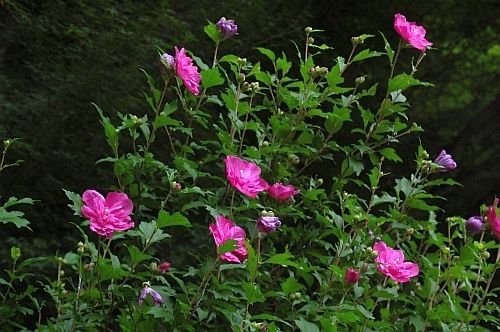 湯之奥金山博物館へのアクセス道路の途中にある2本のムクゲの木に、いまたくさんの花が見られるようになりました。 本格的な夏の到来を静かに物語る、八重咲きの大きな花です。