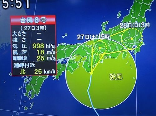 今朝の6時前の天気情報、特に台風6号に注目です。というのは、この影響がどのようになるかで、今日の砂金掘り大会の開催が左右されそうだったからです。 ふんふん、そう来たか・・・。だいじょうぶだな。 続けて雨の降り方の予報です。雨が降ることはしかたない。でも、そんなに大降りではなさそう・・・。 ということで、7時集合の博物館にむけ、あわてて家を出たのでありました。