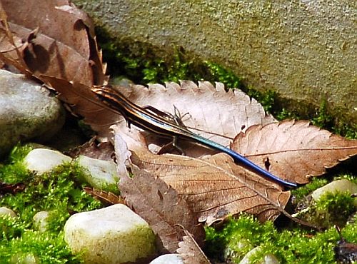 湯之奥金山博物館の事務室の背後に明かり取りスペースがあって、ガラス戸越しにそこにトカゲがいるのが見られました。まだ子どものトカゲです。