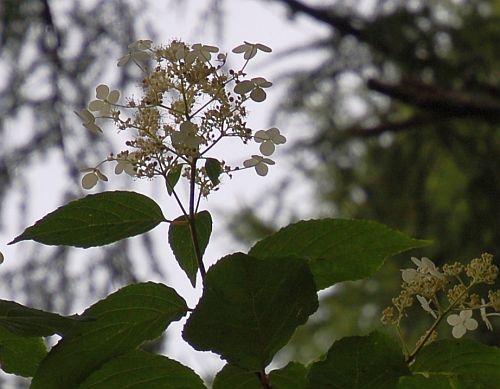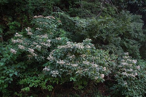 この8月11日、「山の日」の祝日でもありましたが、この日をメインに翌日にかけ、『こども金山探険隊』というイベントがありました。 イベント初日には、中山金山遺跡まで、応募された親子20組あまりで 登山し、実際の金山の跡を見学してきました。その際、お弁当を食べたE-2テラスの周辺では、あちこちにリョウブの花が咲いていましたが、合わせてこの花も見られたのです。 リョウブと違って、その場では名前に心当たりがなく、同行の方からイワガラミではないか、ともご意見もあったのですが、その後、いろいろと確認をすると、イワガラミの場合、「装飾花に発達する萼片が1枚だけ」(ウィキペディア)であるのに対し、こちらは4枚なので、ツルアジサイであろうという結論に至りました。 この夏の、とくに「山の日」での思い出の追加です。