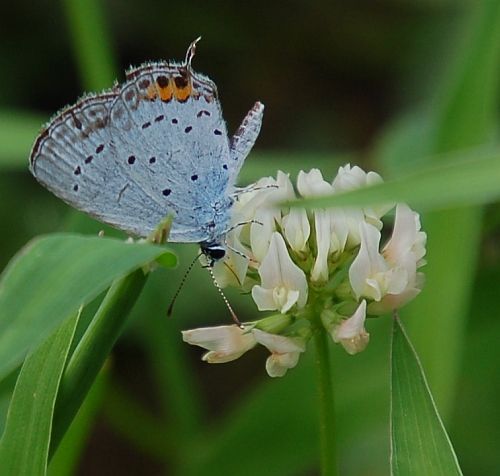 湯之奥金山博物館の隣の下部リバーサイドパークで観察したツバメシジミです。シロツメクサの花で、吸蜜(お食事)していました。