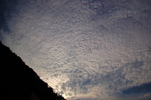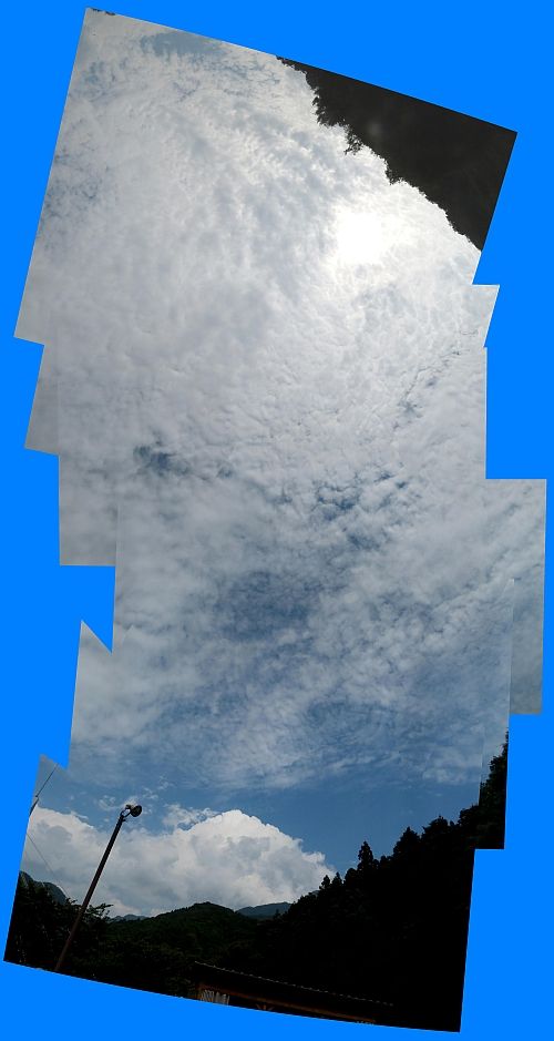 6枚のお空の写真をつなげてみました。画面の下が東、一番上は西の空となります。昨日の夕方のお空を180度パノラマにしてみたものです。 東の山際の空には、まだ夏の雲、入道雲がわいていました。でも、天頂に寄った方から西のお空には、鱗雲が広がっていました。夏と秋のせめぎ合いです。