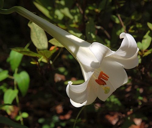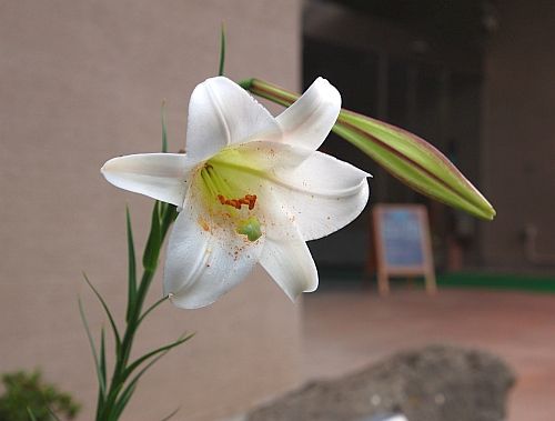 湯之奥金山博物館の正面玄関の脇に、こうしてかわいくタカサゴユリが咲いていました。 そうそう、ユリの花の向こうに、ぼやっと、前回紹介のウェルカムボードが見えていますね。
