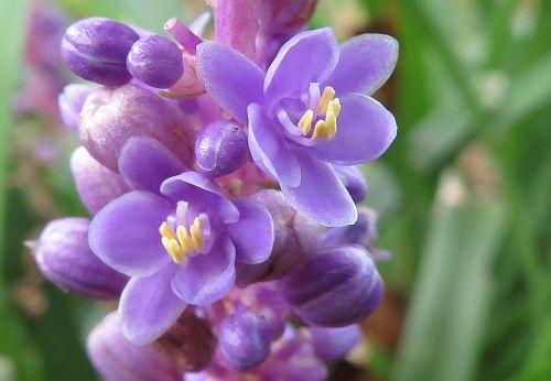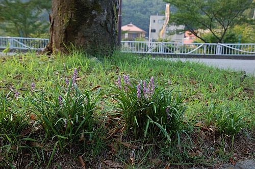 とてもきれいに咲いています。かれん・・・。 湯之奥金山博物館の前庭の真ん中、ケヤキの木の根元なのですが、ほとんどだれも気付かなくて、かたわらを通り過ぎてしまう。とても小さな存在なので、しかたないことではあるのですが・・・。 このヤブランも、春の除草管理で根元から刈り取られたのですが、夏になって急に葉を伸ばし、がんばって、こんなにかわいく咲いてくれています。