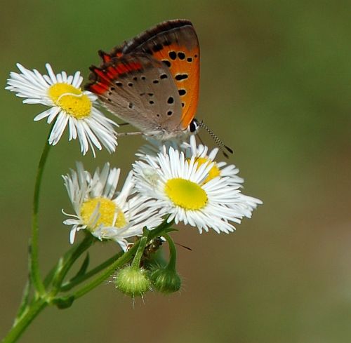 湯之奥金山博物館の隣の下部リバーサイドパークで、ヒメジョオンの花にベニシジミがとまっているのを見ました。お食事中です。 こちらは、別な個体。右前翅の尖端が痛んでいます。同じようにお食事中。 いずれも、夏型の濃い色をしています。