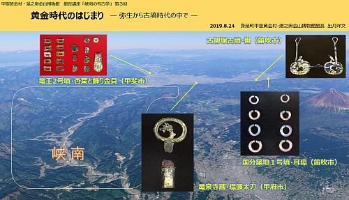 8月24日のことでした。第3回館長講座がありまして、古墳時代に、武具・馬具・装飾品など、高塚式の墳墓に埋葬の際、副葬された品々の中に、金を用いたものがたくさんあったのです・・・という趣旨のお話しでありました。 とくに夏の、ということはなく、金山博物館で行われる講座として、金をテーマにした、というものでありました。