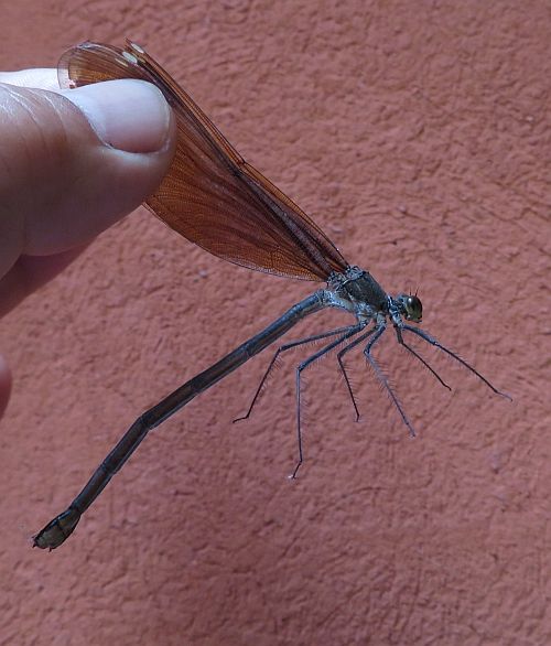 博物館内に侵入したトンボがお縄になりました。別に悪意があったわけでもなさそうです。というか、そのまましていたら、館内で絶命してしまう可能性も・・・。 そこで捕虫ネットで捕獲され、強制退去に。お別れの前に、手配書用でもないですが、お写真をいただきました。カワトンボの仲間だと思われます。あるいは、ミヤマカワトンボかと・・・。