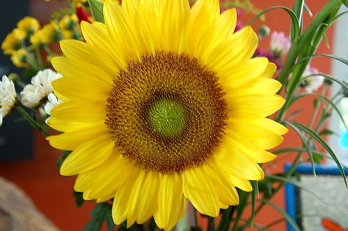 湯之奥金山博物館の受付カウンターの花瓶にヒマワリの花一輪。 真夏の太陽は見たくても見ちゃダメ、目がこわれる・・・。こちらのは、見てもだいじょうぶ。たくさんのお客さまに、あたたかいまなざしを注ぎつつ、お迎えをさせていただいております。