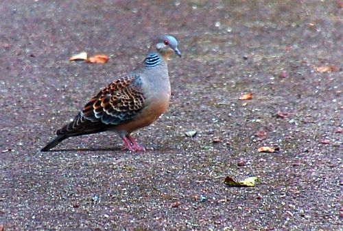 最初、湯之奥金山博物館の建物の陰にいました。少しして陽が当たる場所に歩いていって・・・。 きれいな色をした、キジバトです。このあと、ちょっと不思議な・・・。 少し他に目をやっていた後、再びキジバトのようすを確かめると、こんなふうに舗装面に腹ばってしまっていたのです。なんでだろう・・・。