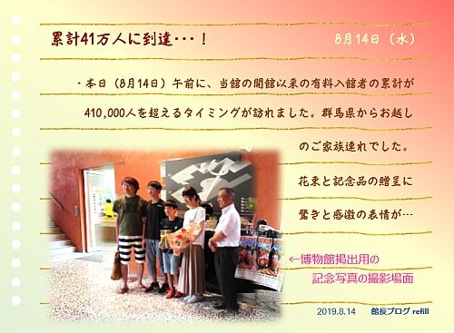 ムクゲの花がきれいに咲いていた日。41万人目のご来館のご家族をお迎えしました。湯之奥金山博物館のご利用は、年間2万人弱なので、ほぼ1年間に2回のペースで、こうしたイベントがやってきます。 夏の思い出の一コマにとどまらず、引き続きたくさんのご利用がいただけますよう、スタッフ一同、皆さまのご来館をお待ちしております。