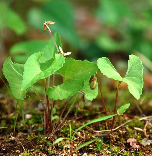 湯之奥金山博物館の前庭、駐車場となっていますが、その一角にカエデの木が植えられていて、その根元にこうした小さな植物がいっぱい見られます。 今回注目は、このスミレの仲間、たぶんタチツボスミレと思われますが、スミレの仲間特有の閉鎖花が見られるところです。画面左側上方には、閉鎖花が結実してはじけてしまったのも確認できます。 別な株でのようすです。花びらは開かないものの、これで咲いているというのですからほんとに不思議です。