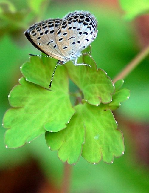 春から夏に花を楽しませてくれるヤマオダマキですが、今年は、花の咲く前と夏草の時期に除草管理で刈り取られていて、花はお休みでした。いままた、新しく緑をなしています。その若い葉の上に、ヤマトシジミがとまって、しばし休んでいる姿が見られました。