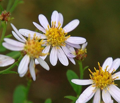 下部リバーサイドパークの最下流部の川岸に、野菊がやさしく咲いています。この撮影時には、今日のような雨があって、雨粒がやどっていました。 後日、雨のない時に撮りなおしました。自然界のキクの花、ユウガギクだと思われます。 同じ花が、下部リバーサイドパークの上流部、博物館へのアクセス道路の始まりに当たる温泉橋のたもとにも、まとまって咲いています。こちらはちょっと賑やかでありました。お祝いムードには、こちらの方がいいかな。