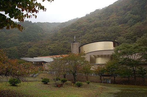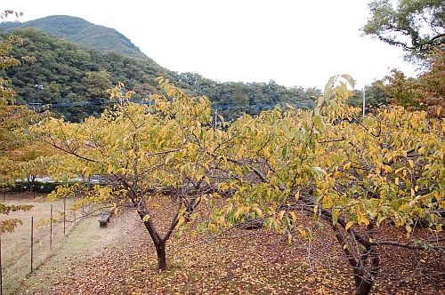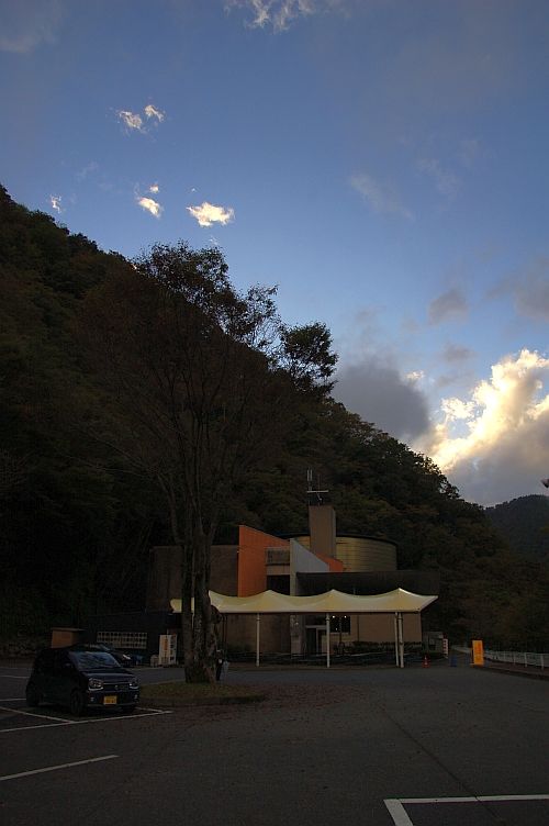 こちらは、博物館へのアクセス道路から見た、下部リバーサイドパークのカワヅザクラです。10数本が植栽されていますが、いちばん日当たりのよいこの写真のあたりから紅葉がはじまっています。お日様が出ていればもっときれいに見えるのでしょうけど、撮影時は、曇り空でした。 秋の行楽シーズンとなっていますが、お天気の方がさっぱりしませんね。 皆さまの湯之奥金山博物館は、本日は定期休館となっております。ご留意くださいませ。明日の木曜日からのご利用をお待ちしております。