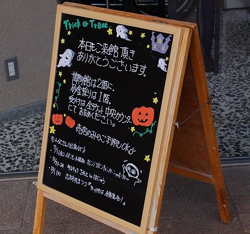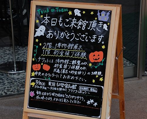 そもそも「ハロウィーン」って何。 いつも便利に使わせてもらっている『ウィキペディア』の「ハロウィーン」の項目によれば、毎年10月31日に行われている、もともと古代ケルトの人々のお祭りが、流れ流れてU.S.アメリカの民間行事になったものだって。もともとは宗教的な祝祭だそうだが、いまやそれが忘れ去られてたんなるバカ騒ぎ(それは日本にはいって激化したみたい)になっている、ということらしいのです。 それはともかく、湯之奥金山博物館の正面玄関に置かれ、お客さまを歓迎しているウェルカムボードのいまは、ハロウィーンモードですが、何度かマイナーチェンジしていて、これがタイミング的にラストバージョンです。 これまでの、このウェルカムボードについてのバックバージョンは、カテゴリ「今頃のウェルカムボード」をクリックいただけるとご覧になれます。