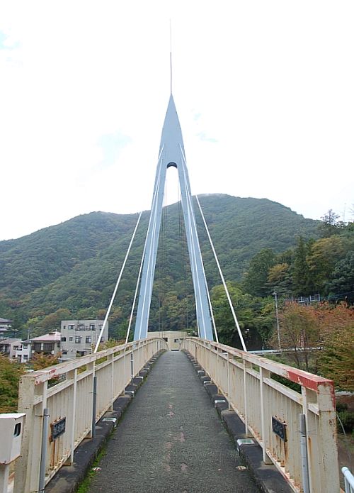湯之奥金山博物館とJR身延線の下部温泉駅とを結ぶ人道橋のふれあい橋です。1基の橋塔がつり下げる斜張橋という形式を取っています。愛称が「メロディーブリッジ」となっていますが、ここを歩くとセンサー(例えば画面の左端下側)の働きで、いまごろは「里の秋」といった感じで、四季折々のメロディーが流れるので、親しみを込めてそう呼ばれています。 さて、その橋を・・・。 『いっぽんばし わたる』という五味太郎さんの絵本がありまして、そこでは一本橋(丸木橋みたいなの)をヘビとかライオンとかアリとかキリンとか、いろいろな生き物たちと元気な男の子とが次々にわたる展開が繰り広げられています。五味太郎さん独特のユーモラスな絵と言葉遊びの世界とが楽しめるものとなっています。その内容が、youtubeで紹介されているのもありますよ・・・こちらから。 今回のこの記事のお話しは、その中の「わざわざわたる」のカラス版です。 1羽のハシボソガラスが、チョンチョンと、メロディーブリッジを渡っていたのです。しかも欄干手すりの上を。わざわざ・・・。 チョンチョンと進み、時々、あっち、キョロキョロ、こっち、キョロキョロしながら・・・。動画を撮ってなく、十分にご紹介できなくてちょっと残念です。