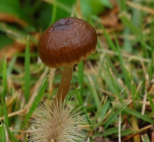 少し前に、3種類くらいのキノコ、下部リバーサイドパークで見られました、とご案内しましたが、昨日またあらたに、こんなキノコが見つかりました。なお、手前のもじゃもじゃはエノコログサの穂の枯れ落ちたもので、キノコとは関係ありません。