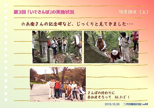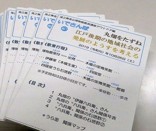 第3回「いでさんぽ」は、当初は10月12日(土)に開催予定でしたが、あのいまわしい台風19号のあおりを受けて昨日、10月26日(土)に変更となっておりました。 昨日は、午前は晴れたものの、午後から曇り空となってきて、ちょっと不安がよぎりました。でも、最後まで予定どおり実施することができました。 博物館にもどってからの反省会も、けっこう盛り上がり、こうしたイベントの意義に皆さん、心からご賛同いただけ、うれしいかぎりでございました。皆さまのご支援ご協力にあつく感謝申し上げます。