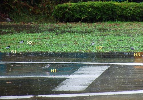 10月25日の雨の日の、下部リバーサイドパークでの観察メモです。リバーサイドパーク最下流部にあるヘリポートのまわりでたくさんのセキレイを見かけました。 たくさんといっても、セキレイはもともと大きな群れをつくったりしませんので、偶然に餌をとるタイミングが集中したと見るのがいいと思います。 この写真では、2羽のセグロセキレイ(画面左側)と3羽のハクセキレイとが確認できますが、この枠の外にも、もう少しいた感じです。