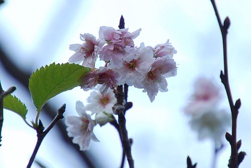 3輪のジュウガツザクラで、1つのつぼみから生まれた3姉妹(?!)です。右側の向こう側のいちばん上のは、かなりピンクになっています。 このように、つぼみのたくさんあり、次々と開き始めてくるのです。ソメイヨシノのように、いちどにパッと咲くものではないですが、次の春にソメイヨシノが満開を過ぎる頃まで、ずっとずっと楽しませてくれます。
