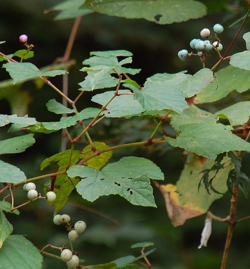 ノブドウが、博物館へのアクセス道路の山側の茂みの中にありました。いくつもの丸い実が見られました。 基本は白い実です。この他に、青緑から青紫まで、色がついたものがありますが、それは実の中に虫が寄生した結果によるそうです。 ノブドウは、ブドウ科ノブドウ属の落葉つる性木本、つまりブドウの野生版ということですが、その実は食用には適さないそうです。